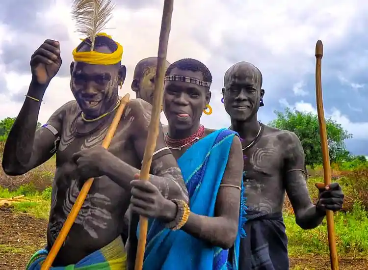 The Mursi people are known for their distinctive lip plate tradition practiced by women.